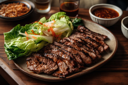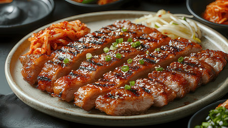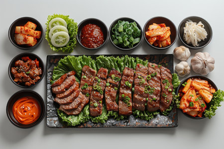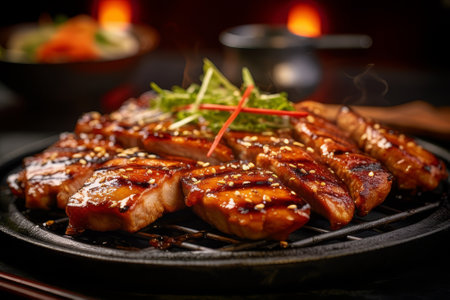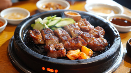 Traditional Korean bulgogi on a sizzling grill with a side of kimchi. Perfect for food blogs and menus
