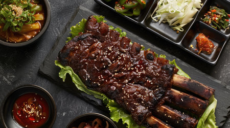 A beautifully arranged meal featuring tender meats, rice, and vibrant side dishes. Perfect for showcasing Asian culinary traditions in a dining setting.