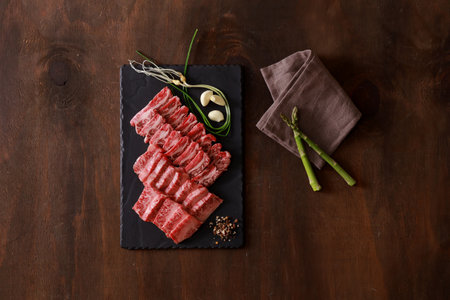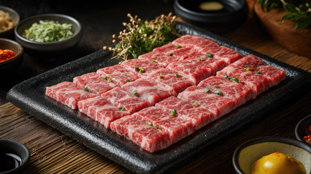 Gourmet Japanese Wagyu beef slices neatly arranged on a plate, ready for BBQ grilling. Ideal for food photography highlighting premium meat quality.
