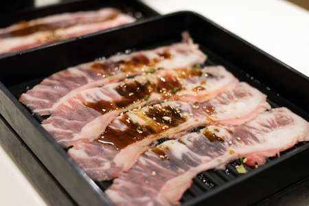 Beef slice on black tray for hot pot or grill (barbecue or yakiniku).