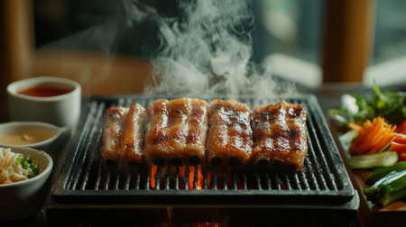 A sizzling pork belly on a grill, surrounded by fresh vegetables, dipping sauces, and condiments, with steam rising from the heat