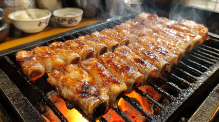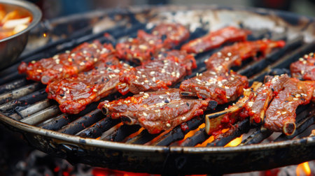 A Korean barbecue grill with marinated beef and pork ribs sizzling over hot coals, ready to be grilled.