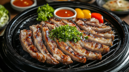 Succulent grilled pork slices garnished with fresh herbs served on a sizzling barbecue plate. Perfect for a flavorful dining experience.