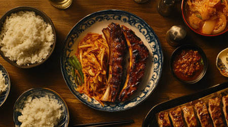 A beautifully arranged plate featuring tender ribs, rice, and colorful vegetables set on a wooden table, capturing the essence of Asian dining.