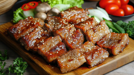 A mouthwatering presentation of grilled meat topped with sesame seeds, served alongside fresh vegetables and herbs on a wooden platter. Perfect for any meal.