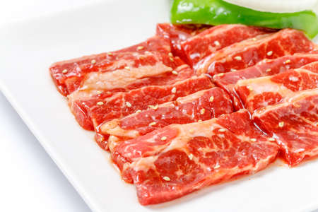 Raw beef for barbecue, arranged on a grill in a Japanese yakiniku restaurant, with space for copy, ideal for menus.