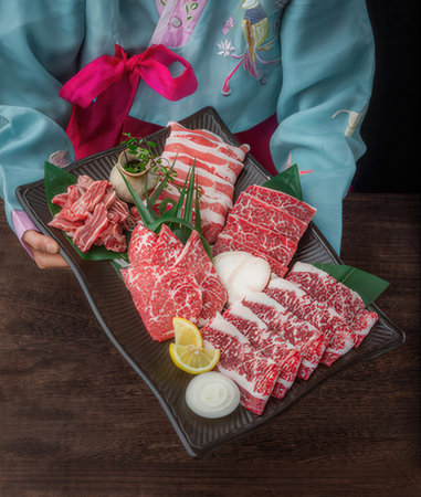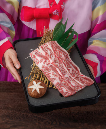 Close-up of Hanwoo Beef, Korean rare meat, prepared for barbecue grill with soft focus