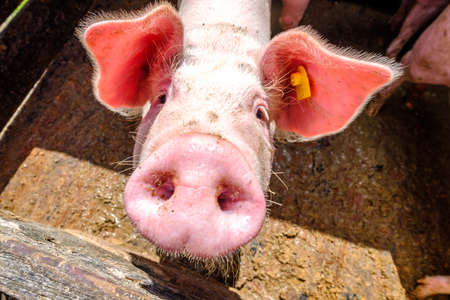 Happy pig with dirty snout poses for the camera. Domestic animals farming.