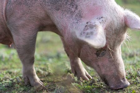 Pig animal on farm, mammal domestic nose pork, cute nature.