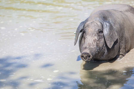 Hairless breed of black iberian pig. Extremadura, Spain. enjoying the pond