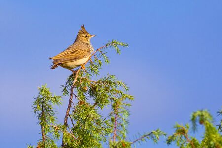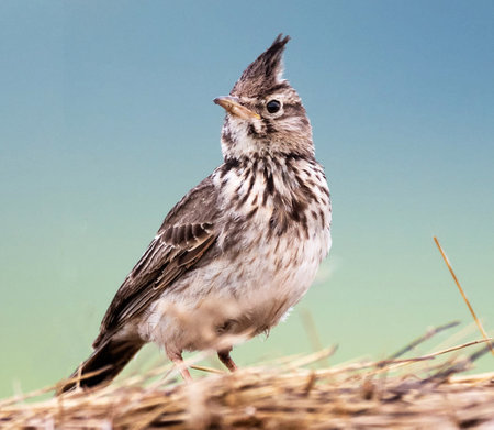 A portrait of a crested lark(Galerida cristata) singing and calling in front of a blue sky.