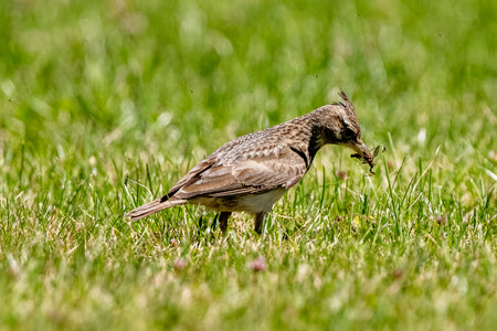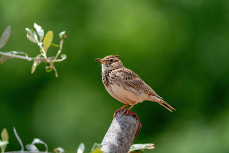 Lateral view of a Crested Lark resting in a city center of The Netherlands. selected focus in a urban area with a green background