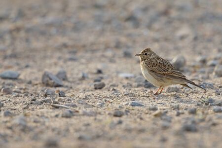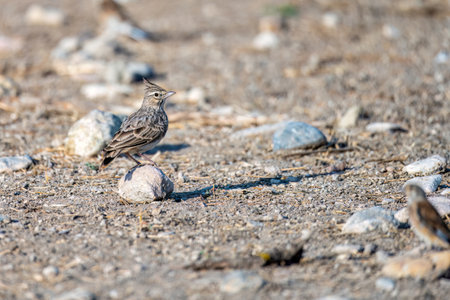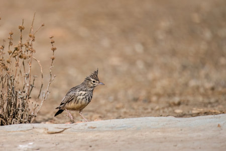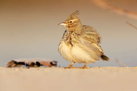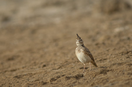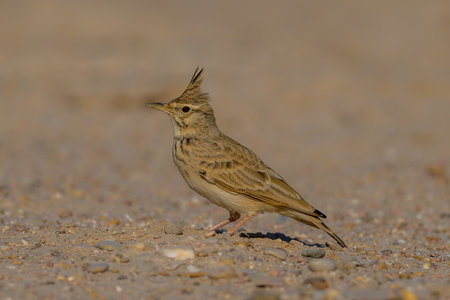 Side posing view of a Crested lark (Galerida cristata) standing on the ground in a desert environment in Dubai, United Arab Emirates.