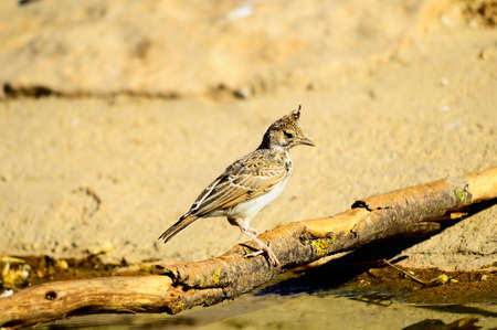 The crested lark or Galerida cristata common small grey brown bird with forelock on the sunny beach.