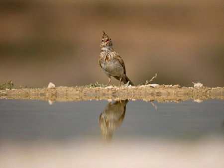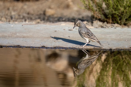 Crested lark by the edge of a puddle with a clear reflection and dry ground background