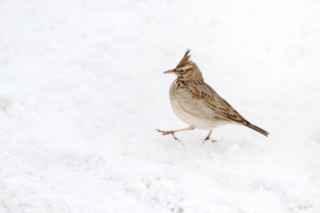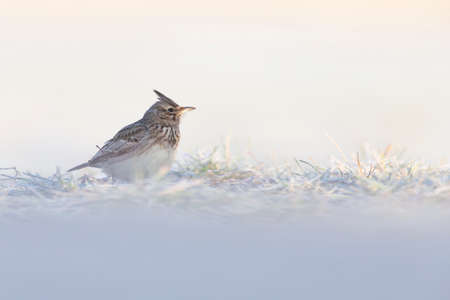 A crested lark (Galerida cristata) resting and foraging in a frozen meadow in the morning light