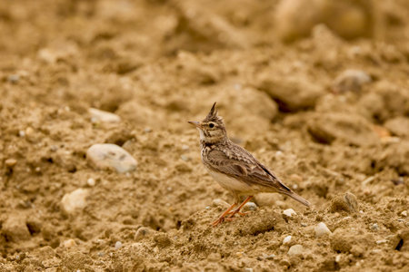 A crested lark standing alert on stony, arid soil, typical of its preferred open-ground habitats