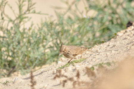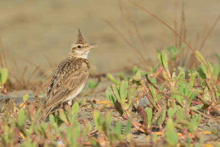 A Crested Lark Galerida cristata on the beach with its crest raised