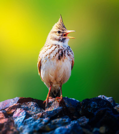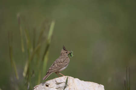 Beautiful Crested lark (Galerida cristata) sits on rocks on green grass nature background
