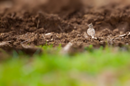 Crested lark (Galerida cristata) sits on the field in its natural habitat (almost invisible due to its protective coloration).