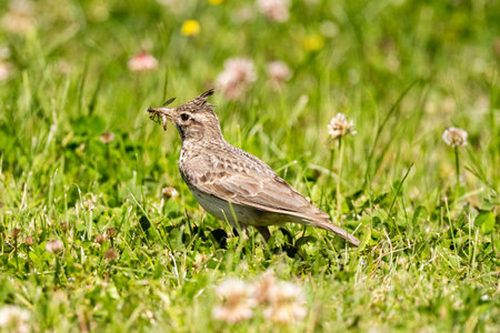 A Crested lark (Galerida cristata) resting in a meadow backlit in the morning light.