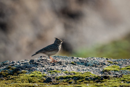 A Crested Lark Galerida cristata, sitting on a rock in a beautiful light. Close up.