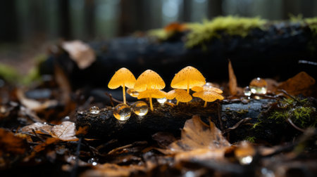a group of mushrooms in the forest with water droplets on them