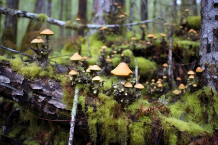 moss and fungi flourishing on burnt forest debris, created with generative ai