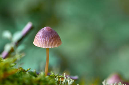 Tiny mushroom growing among moss in the forest macro