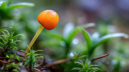 A striking small orange mushroom stands tall above the green forest floor, surrounded by lush greenery and kissed by dew drops, showcasing nature's wonders.
