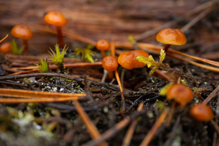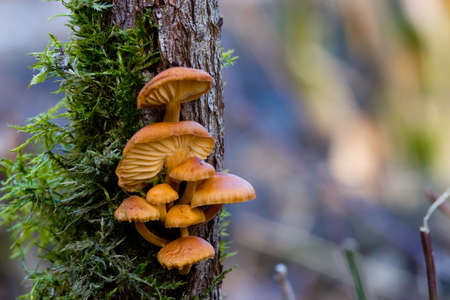 Small, orange mushrooms growing on a tree trunk in forest during late summer. Natural woodlands scenery in Latvia, Northern Europe.
