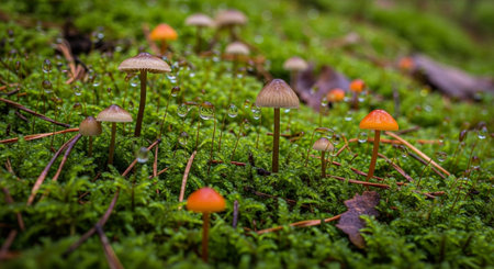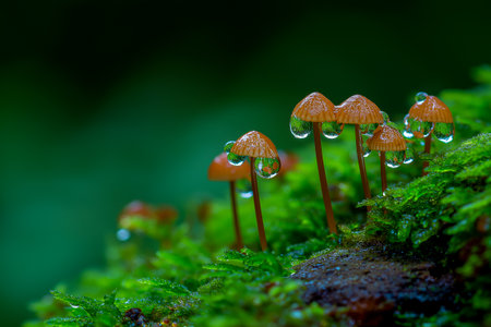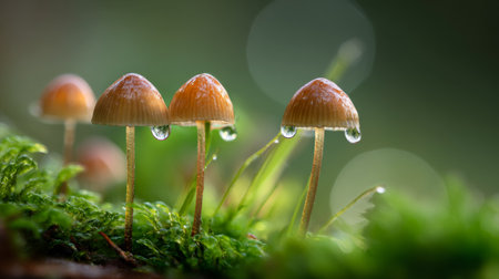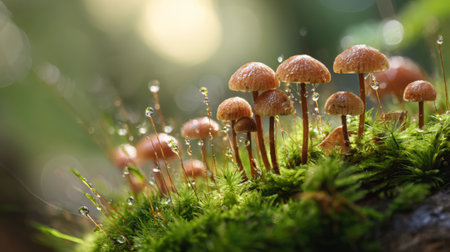 Captivating close-up of delicate mushrooms adorned with dew drops, nestled on vibrant green moss, showcasing the serene beauty of nature's ecosystem in soft focus.