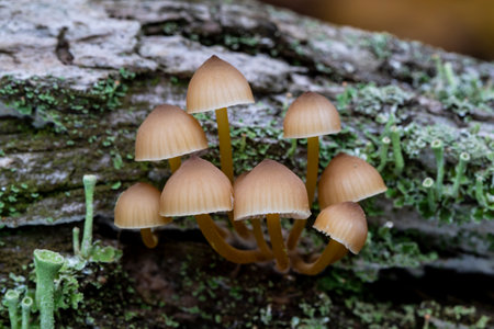 Closeup bunch of small mycena mushrooms growing on mossy trunk of fallen tree in forest