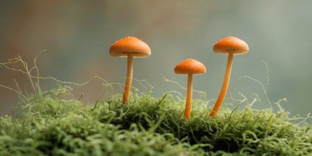 AI Generated. Three Small Orange Mushrooms Growing In Moss