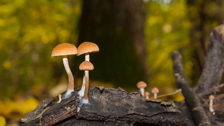 Psathyrella pygmaea mushrooms on an old stump, closeup