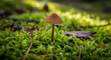 A delicate, small brown mushroom stands in a bed of lush, green moss on the forest floor, dotted with morning dew. The magical, low-angle macro shot is beautifully lit, highlighting the details of the fungi and its natural environment.