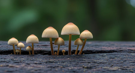 Close up captures a cluster of petite brown mushrooms on slender stems, emerging from vibrant green moss. They sit atop a weathered log, showcasing natures intricate beauty and detail.