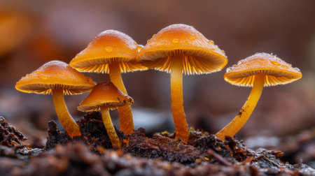 A stunning display of vibrant orange mushrooms adorned with dew drops in a serene forest, showcasing nature's beauty and intricate details amidst a mystical backdrop.