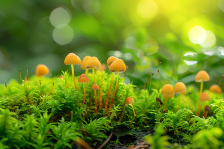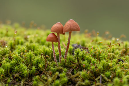 A close-up view of delicate brown mushrooms growing amidst lush, dew-kissed green moss, evoking a sense of natural wonder and the forest floor ecosystem