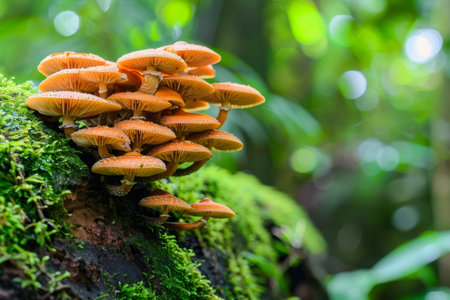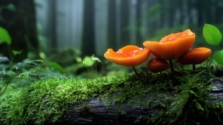 Discover a striking image of vibrant orange mushrooms thriving on a moss-covered log, set in a tranquil forest environment. This close-up captures the beauty of nature and showcases the intricate details of fungi in their natural habitat.