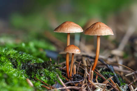Small mushrooms in green moss. Mushrooms with small caps among the moss close-up.
