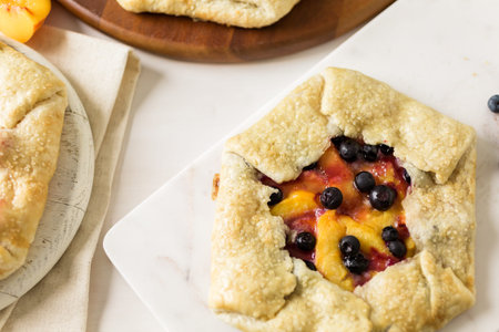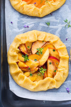 Raw vegetarian nectarine homemade small galette, tart, seasonal summer open pie with aromatic herbs ready for oven. Healthy and tasty bakery product with ripe produce