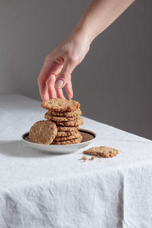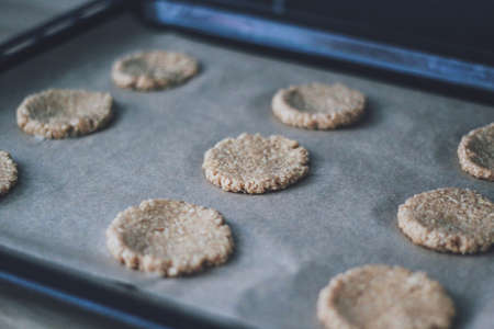 Top view of crispy cookies stacked in a row on black marble. Freshly baked cookies. Selective soft focus.