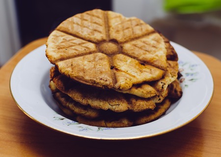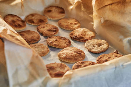 Cooking at home, rows of fresh tasty flatbreads on a wooden table