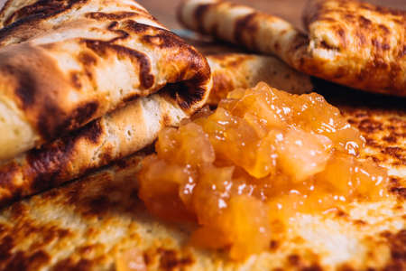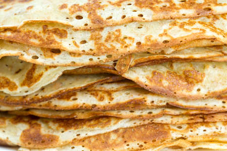 A stack of thin Russian pancakes and crepes folded triangle, close-up, isolated
