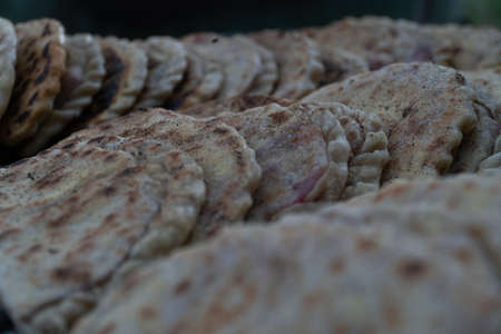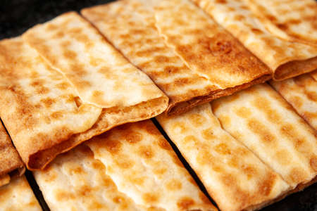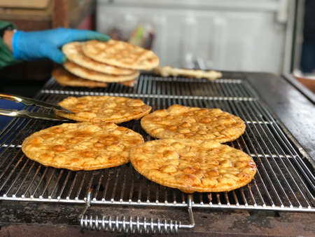 Several pitas closeup on barbecue outdoors. Middle eastern home made freshly baked bread on large bbq grill. Country fair food sale for picnic