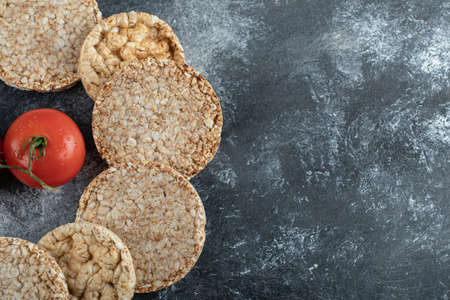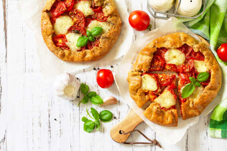 Healthy pastries made from rye flour, diet food. Galette tomatoes, mozzarella and basil on a wooden table. Top view flat lay background. Copy space.