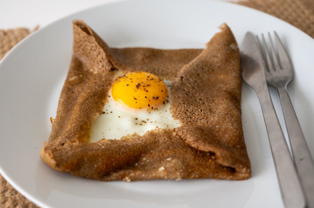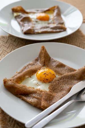 Galettes pancakes from Brittany made with buckwheat flour and served with savory toppings, melted cheese and eggs close up