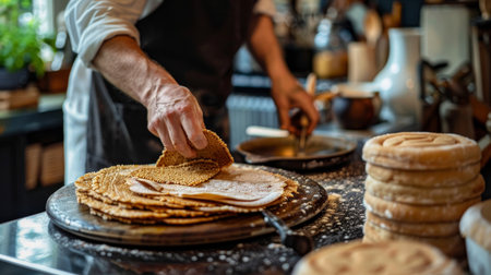 In a warm bakery kitchen, a chef meticulously arranges a stack of crisp, golden wafers, ready for gourmet filling.
