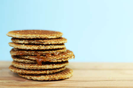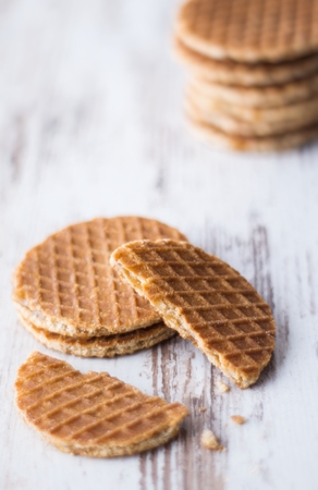 Stroopwafel - traditional dutch syrup waffles with caramel filling - stacked on top of each other on a wooden board, white kitchen, close up